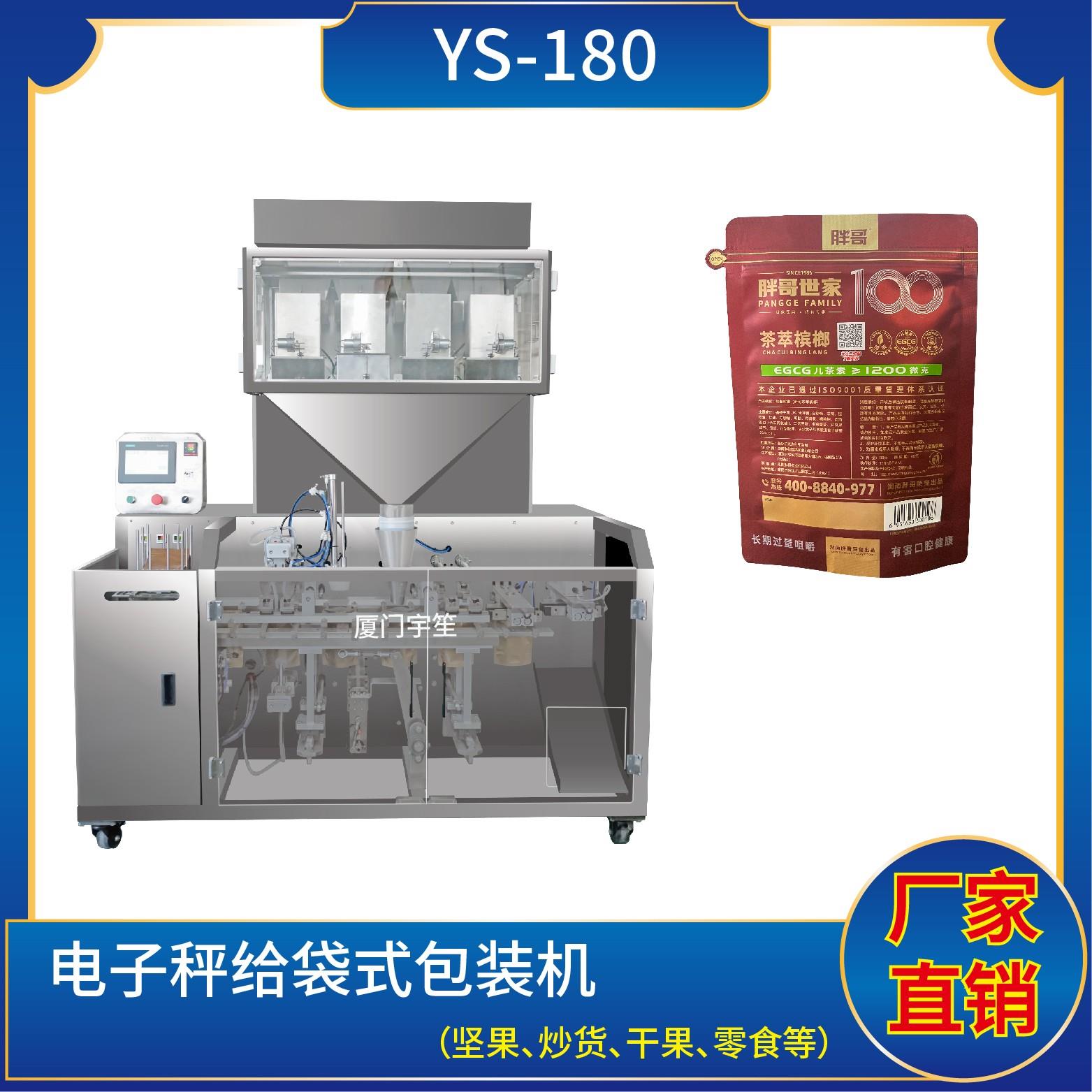 YS-SP180給袋式包裝機 (電子秤)特點:1、適用于食品、醫(yī)藥、化工、化妝品行業(yè)中顆粒、固體、膨化物等物品的計量包裝。2、用于自封袋、站立袋、拉鏈袋。包裝流程全自動,無需人工操作。可根據(jù)充填物料的性質(zhì)選配不同的下料結(jié)構(gòu),且可根據(jù)客戶要求配置打印批號等功能。3、采用觸摸屏操作,PLC控制,封口溫度自動補償,控溫精…