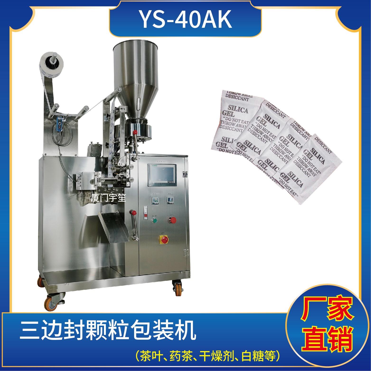 YS-40AK 三邊封顆粒自動包裝機特 點 1、適用于方便面行業(yè)湯包,干燥劑,沖劑,碎茶等小顆粒狀物品包裝。2、可自動完成制袋、計量、充填、封合、分切及計數(shù)等功能。3、包裝材料:茶葉濾紙、復(fù)合膜、無紡布。封口方式:三邊封技術(shù)參數(shù) 計量范圍:10 - 40 g(0.6 ~ 33 ml)制袋尺寸:長 ( L ) : 40 - 110 mm …