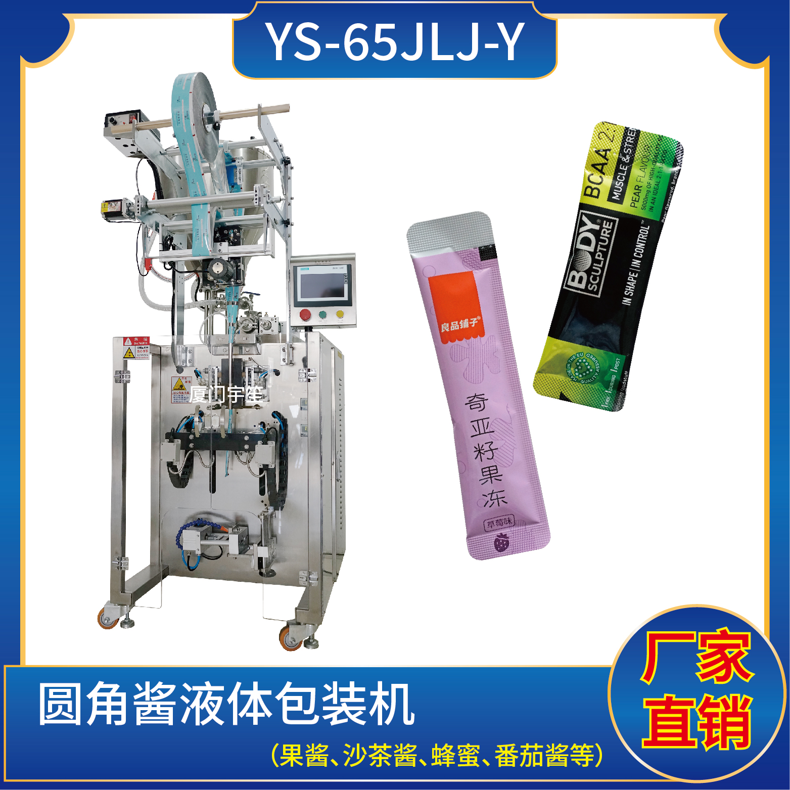 1、適用于食品、醫(yī)藥、化工、化妝品行業(yè)中液體、醬料等物品的計量包裝,如:蜂蜜、酵素、果凍、藥液、糖漿、原漿等。
